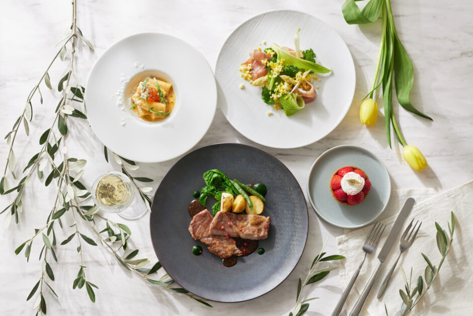 春野菜の力強さと繊細さを一皿ごとに表現した、至福のフルコースをご用意いたしました。「蛍烏賊とホワイトアスパラ」の前菜に始まり、続く二品目では「旬の野菜を心ゆくまで味わっていただきたい」というこだわりを凝縮。香ばしく焼き上げた多彩な春野菜に、新玉ねぎのスープを注ぎ、野菜本来の甘みと香りをご堪能いただけます。魚料理は、皮目はパリッと中はふっくら焼き上げた「真鯛のポワレ」。メインには、低温調理で旨みを凝縮させた「牛ロースのロティ」を新じゃがのローストとともに。一皿ごとに素材の個性を引き立て、春の美味しさを余すことなく堪能できる特別な食体験。大切な方と過ごす記念日など、人生の節目を彩る「祝福の場」にふさわしい、心満たされるひとときをお届けします。