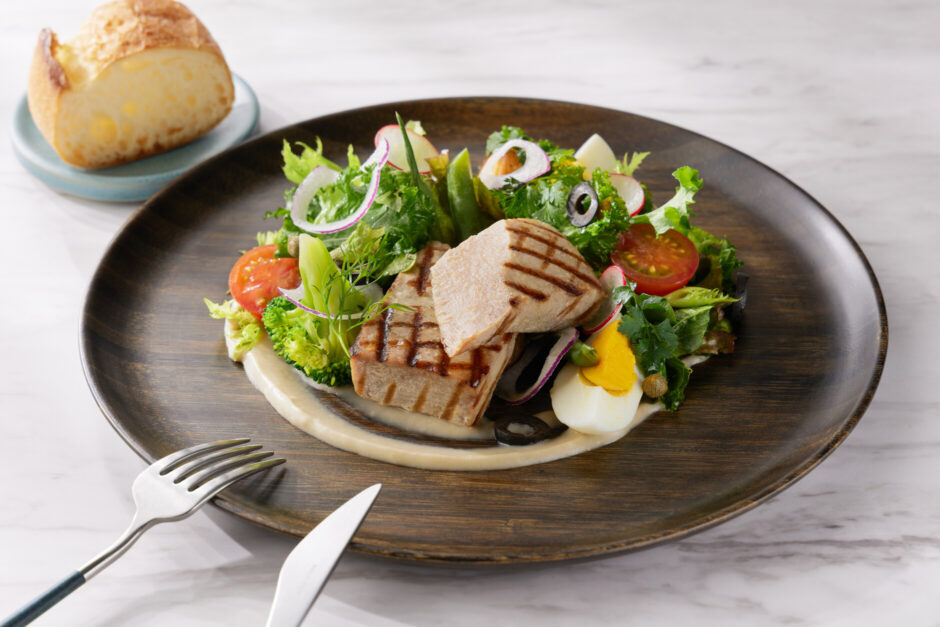 アニヴェルセルのルーツである、フランスの食文化から着想を得た一皿です。主役は、絶妙な火入れでしっとりと香ばしく仕上げたグリルマグロ。南仏ニースの伝統的なスタイルをベースに、アンチョビのコクを効かせた特製ソースが、彩り豊かな野菜の甘みを一層引き立てます。ヘルシーでありながら、本場フレンチの奥深い風味を堪能できる満足感の高い仕上がり。表参道の開放的な空間で、まるでパリの街角を訪れたかのような、優雅なランチタイムをお楽しみください。